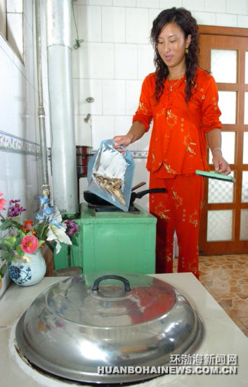 图为该县十一农场农户李俊萍正在向秸秆暖气炉倒入秸秆。李连君、李伟、吕光宇摄