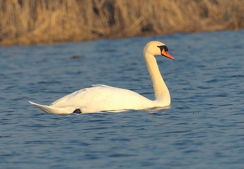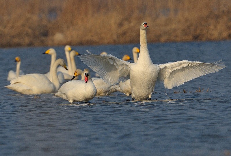 疣鼻天鹅俗称瘤鼻天鹅,属国家二级重点保护鸟类,其特征是体长130—155厘米,体重7—10千克,嘴赤体白,嘴基和前额交汇处有一黑色疣状突起,因此得名。疣鼻天鹅在我国数量较少,主要分布于蒙古、东北、河北、北京、天津、江苏、浙江、山东、台湾等地,栖息于水生植物繁茂的河湾及开阔湖面,以蒲草及水生植物的根茎、叶、果实和小鱼、水生昆虫为食。