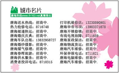 由唐海热线城市宣传名片将发行5000-10000份,通过市场渠道,送到各个沿街商铺、公司和人们的手里,由于精美的做工,实用的内容,具有一定的保存参考价值,其广告价值也不可能估量,我们将为这些在名片背面免费刊登您的电话号码。