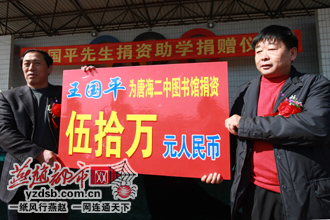 3月9日上午,唐海县第二中学收到了爱心人士王国平先生捐资助学的50万元现金,这笔专款将用于唐海二中的图书馆建设。据悉,王国平先生是一位农民企业家,多次捐资助学,为灾区捐款,并于2008年自己出资60余万元在唐海翻修了一条3公里长的公路,后被人称为“国平路”。目前,已经累计用于慈善事业捐款百余万元。“希望我的捐款行为能够带动更多的好心人,一同关注我们的学生,关注我们的学校,关注我们的社会。”王国平先生说。