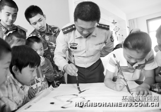 目前,武警曹妃甸边防检查站举办“警营开放日”活动,邀请唐海县五农场小学的小朋友们到警营参观互动。图为边检官兵与小学生们比赛书法。巢军摄
