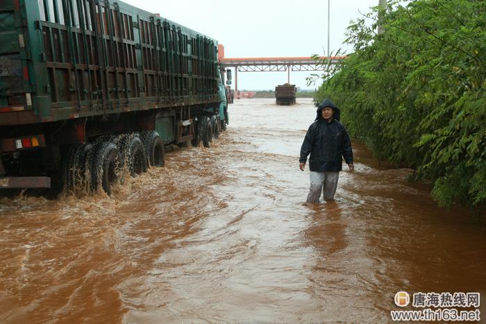 图为该公司领导和员工驱车前往码头前沿途经一段低洼路段关键时刻共产党员、生产技术部经理王广冒雨踏着没膝的积水为车辆探路。
