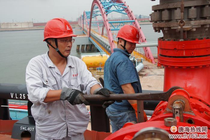 图为员工裴天俊、邓练在进行输油臂接卸作业恢复生产。