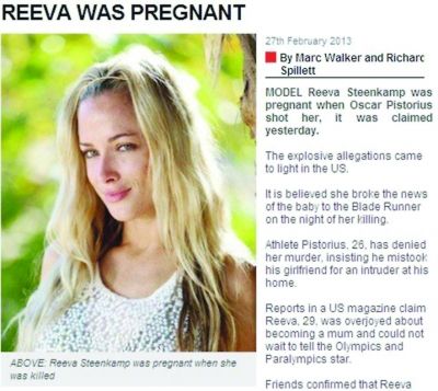27日出版的英国《每日星报》报道称,一个来自于美国杂志的消息源透露,当被皮斯托瑞斯枪杀的时候,实际上斯滕坎普已然有孕在身。而这位超级名模当日前往“刀锋战士”家中的目的,便是要将这一好消息告知自己的男友。