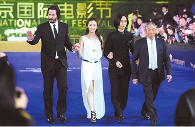 23日,基努-里维斯(左一)和他的《太极侠》团队踏上电影节闭幕式蓝毯
