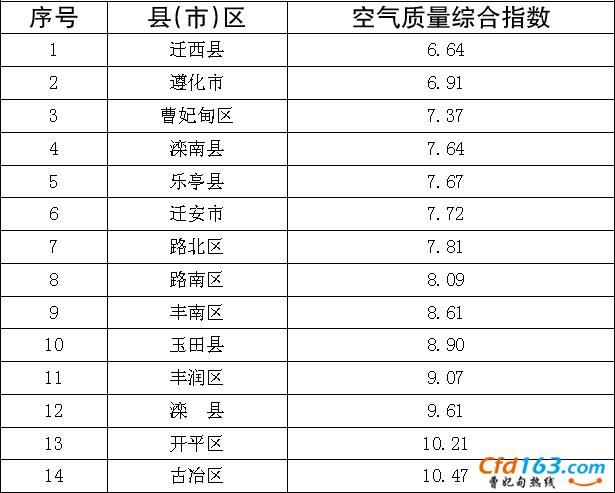 环渤海新闻网消息(赵丽辉刘珲)市环境保护局昨天发布8月份我市各县(市)区空气质量排名。公布数据显示,迁西县、遵化市和曹妃甸区分别排在前3位。