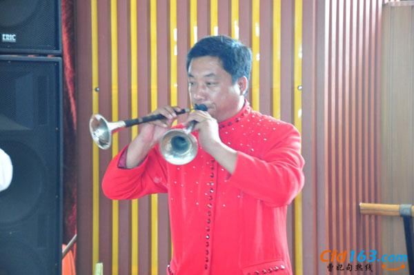 演凑者姚希呐是唐山花吹第七代传人,现在曹妃甸区文化馆工作。他皮肤黝黑,在聊天时并不善言辞。直至他调试唢呐,提出要表演一曲时,记者才发现他眼中闪烁的亮光,整个人一下次活跃了起来。