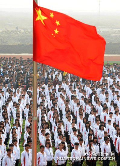 图:开学典礼上,7000名大学生见证国旗首次在新校园升起。
