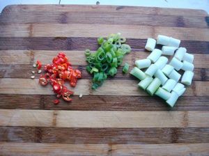 3.葱白切段、葱叶切成葱花,小红椒切小段备用。