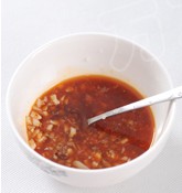 2. 拌蒜汁:蒜拍碎切碎,放入碗中,炝热的花椒油,直接浇在蒜碎上,加辣椒油,生抽,米醋,盐,糖,香油,花生粉拌匀。