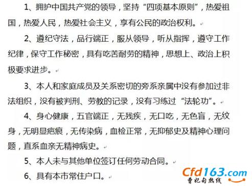 男性,年龄在18至30周岁(1985年1月1日以后出生),身高在1.70米以上,具有国家承认的大专及以上学历,部队退伍军人可放宽到高中学历。