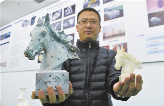 图为王建新博士向记者展示用3D打印机打印出的马头模型(右)。记者 赵亮 摄
